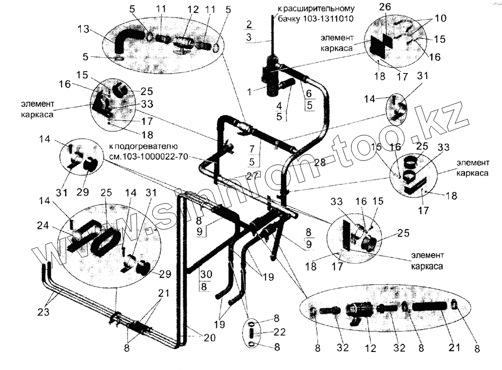 Каталог запасных частей к технике: АМАЗ МАЗ-103 (2005). Установка системы топления в моторном отсеке