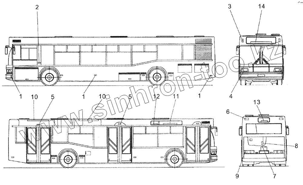 Расположение крышек и решеток на кузове автобусов МАЗ-105