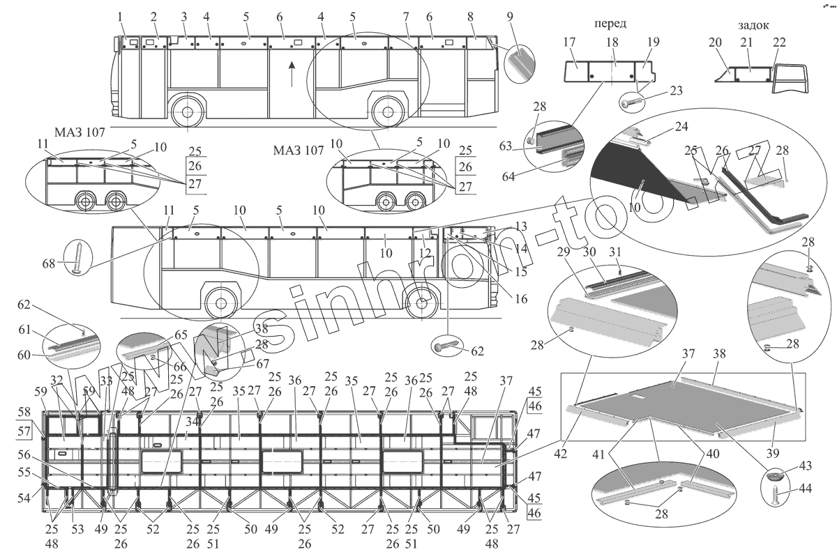 Каталог запасных частей к технике: АМАЗ МАЗ-103 (2011). Установка панелей потолка