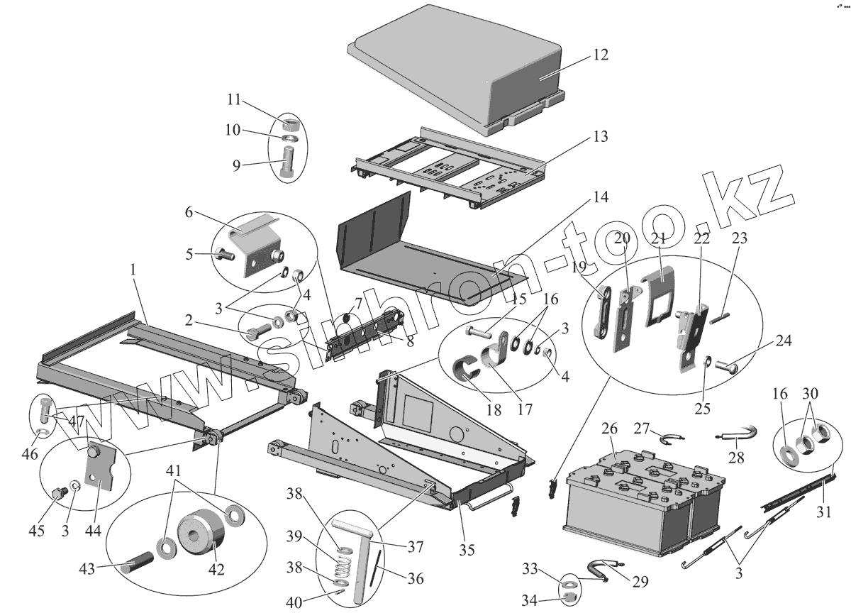 Каталог запасных частей к технике: АМАЗ МАЗ-105 (2011). Установка АКБ (до 2003 года)