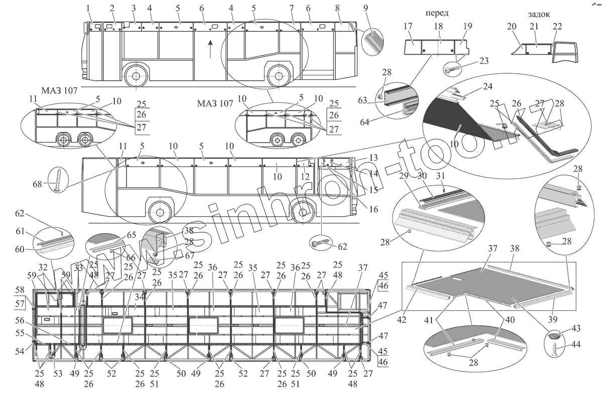 Каталог запасных частей к технике: АМАЗ МАЗ-107 (2011). Установка панелей потолка