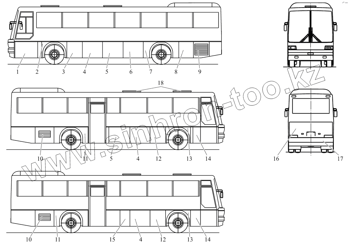 Каталог запасных частей к технике: АМАЗ МАЗ-152 (2011). Расположение крышек и решеток на кузове автобуса