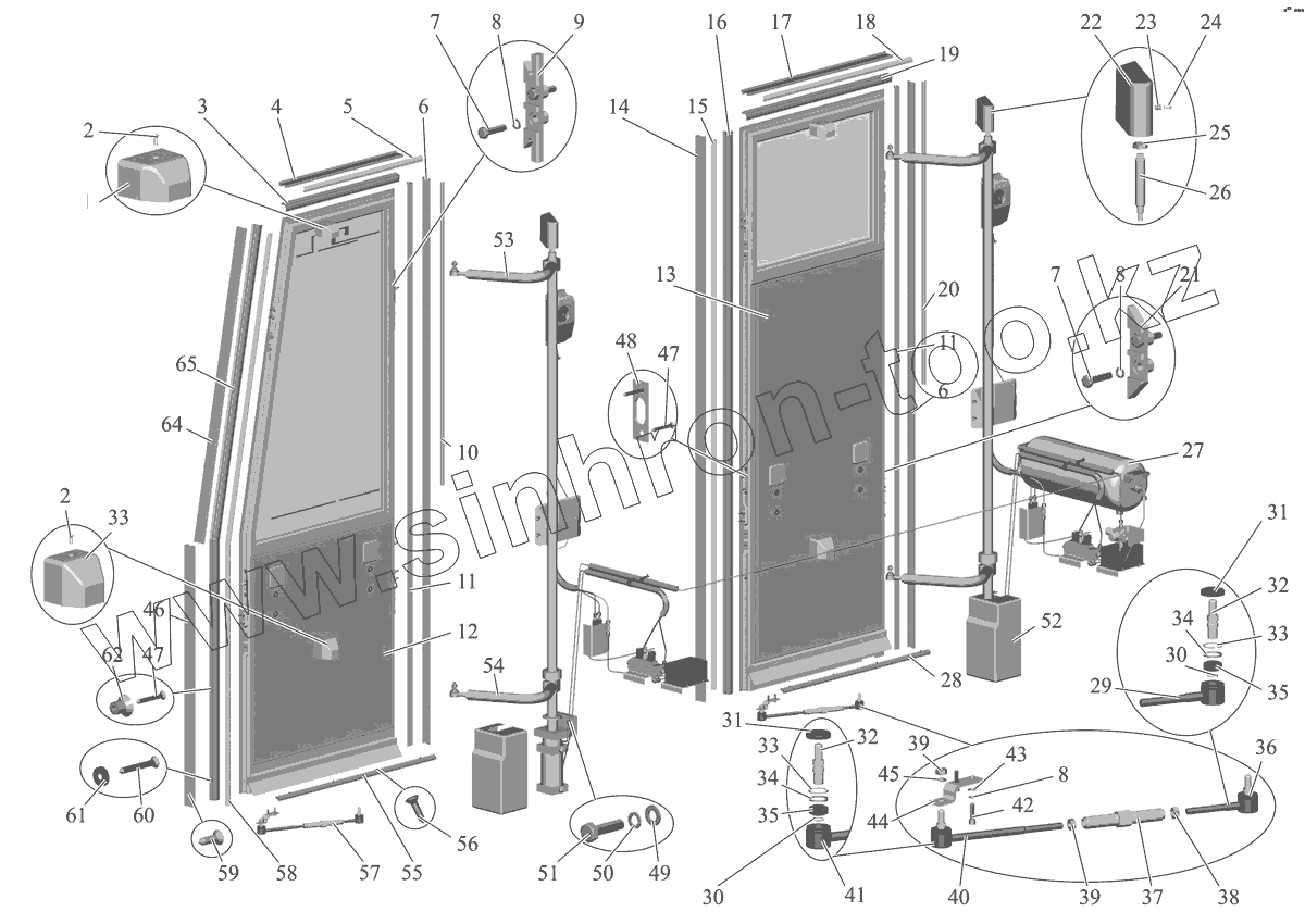Каталог запасных частей к технике: АМАЗ МАЗ-152 (2011). Установка дверей (привод PRVA PETOLETKA) 152-6100003