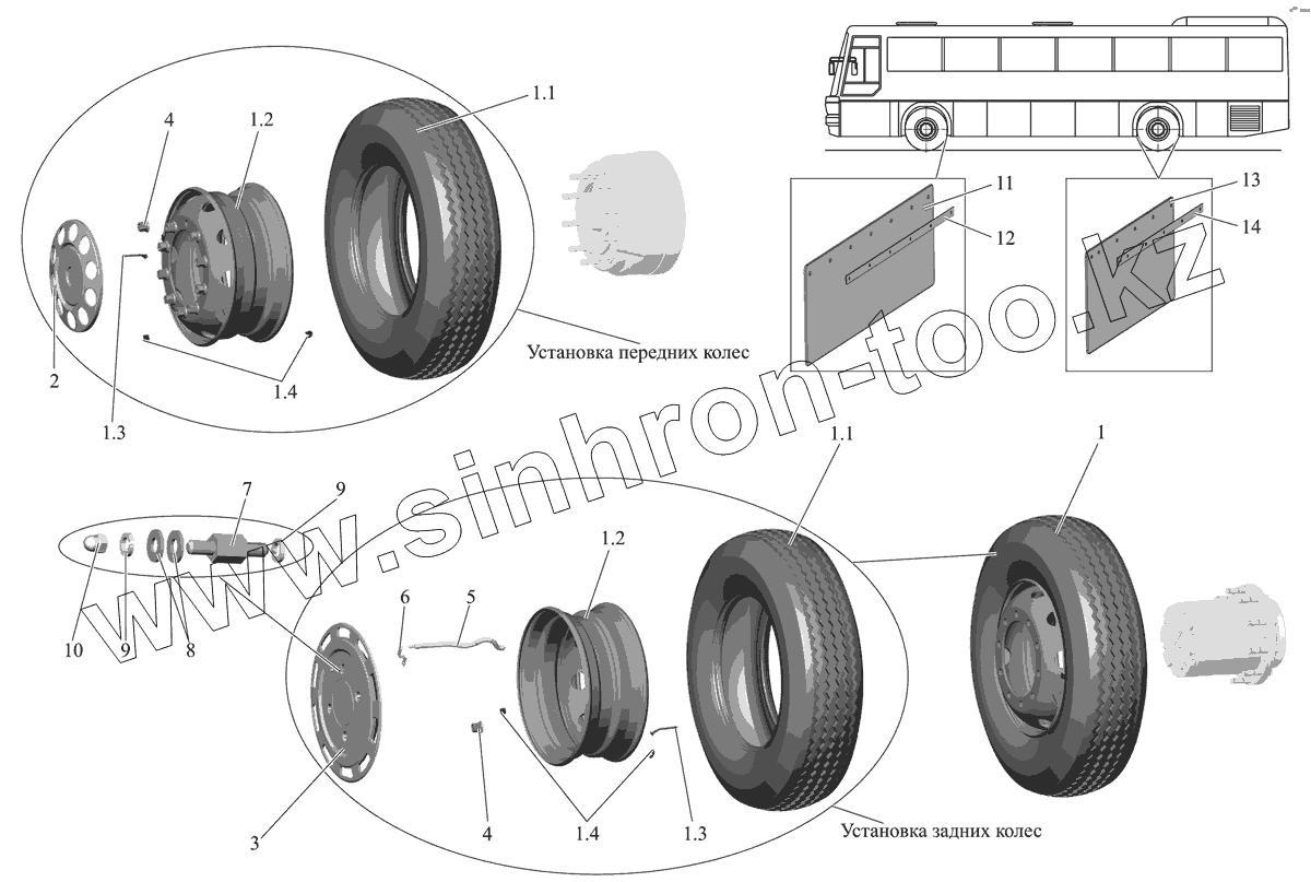 Каталог запасных частей к технике: АМАЗ МАЗ-152 (2011). Установка колес и брызговиков