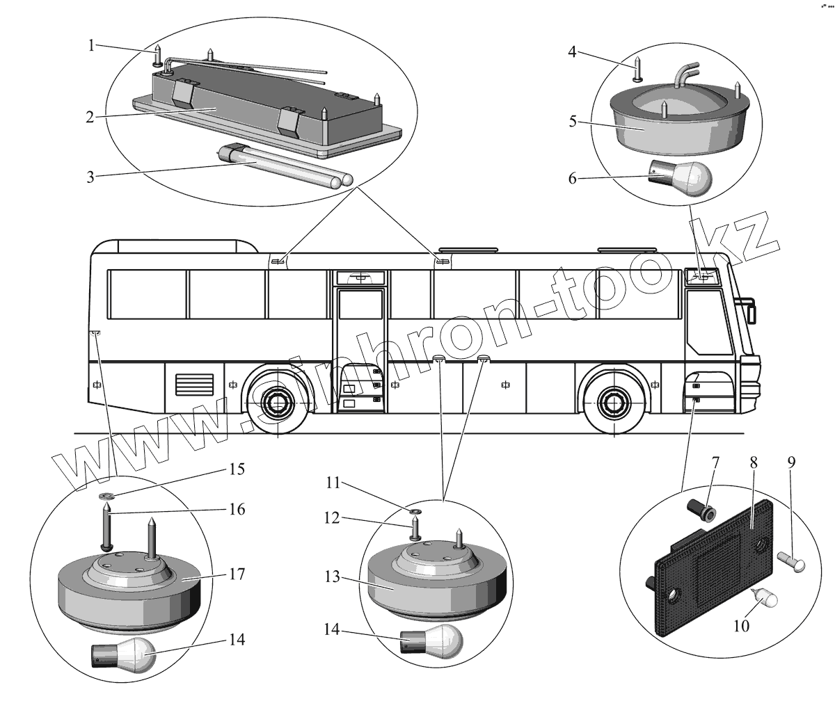 Расположение крышек и решеток на кузове автобуса
