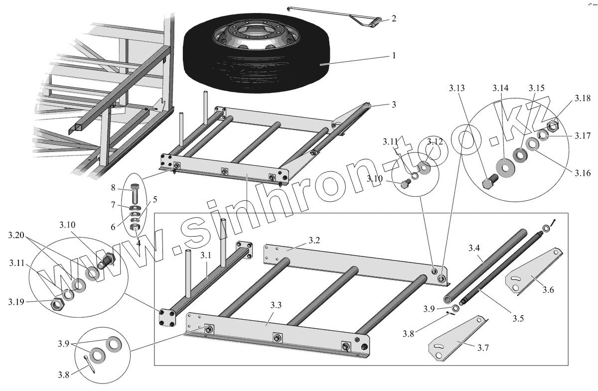 Каталог запасных частей к технике: АМАЗ МАЗ-206/226. Установка запасного колеса 226060-3100001