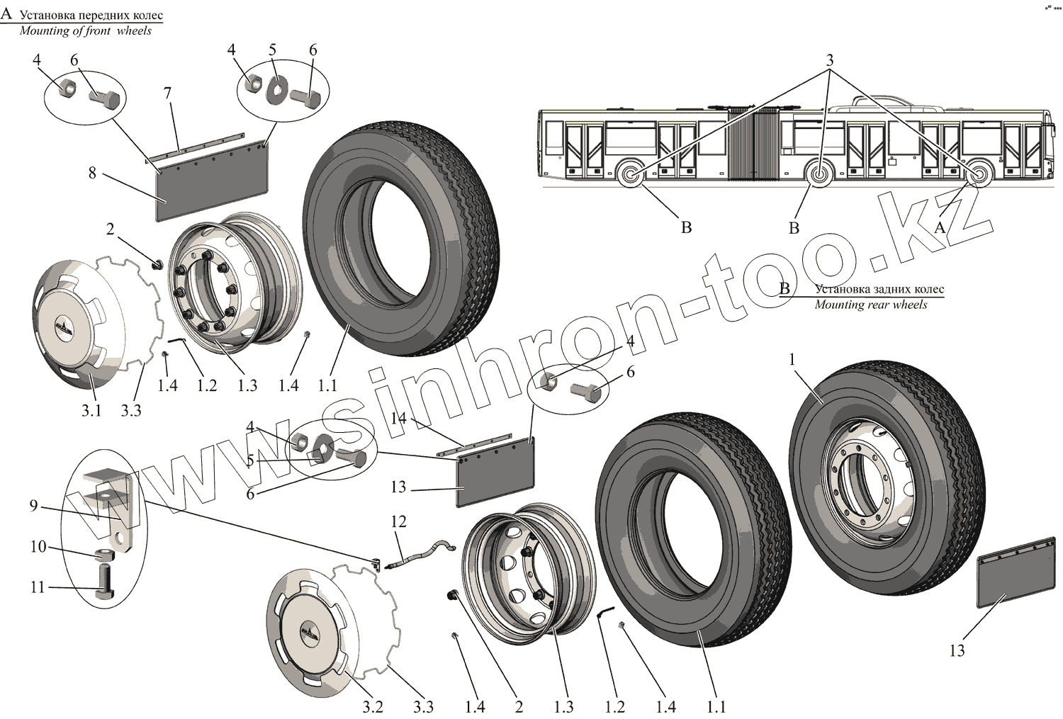 Каталог запасных частей к технике: АМАЗ МАЗ-215. Установка колес и брызговиков