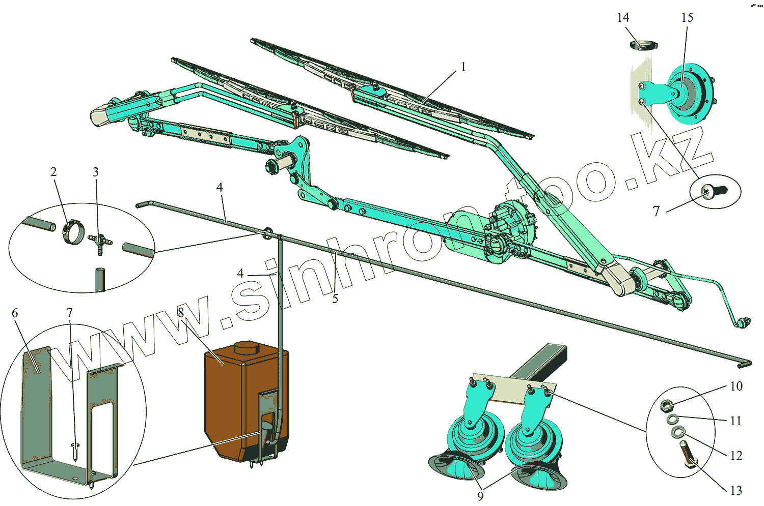 Каталог запасных частей к технике: АМАЗ МАЗ-215. Установка стеклоочистителя, стеклоомывателя и звуковых сигналов