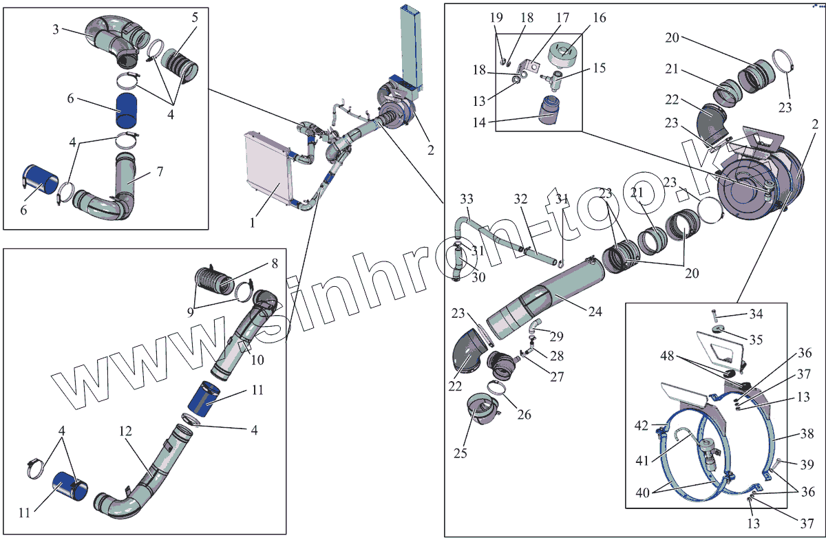 Каталог запасных частей к технике: АМАЗ МАЗ-231. Установка воздухоочистителя и охладителя наддувочного воздуха