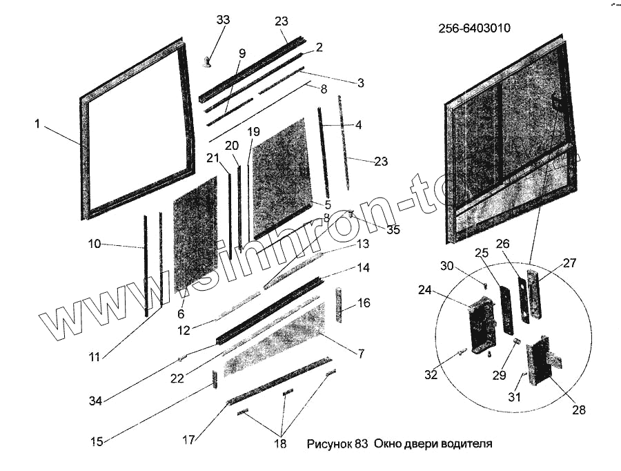 Каталог запасных частей к технике: АМАЗ МАЗ-256. Окно двери водителя 256-6403010