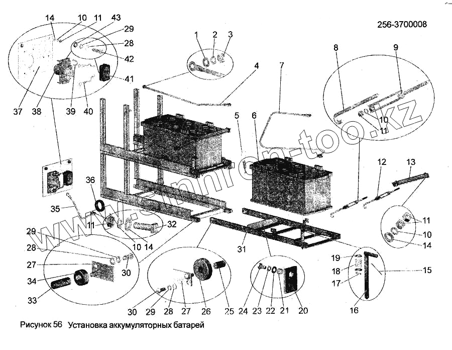 Каталог запасных частей к технике: АМАЗ МАЗ-256. Установка аккумуляторных батарей 256-3700008
