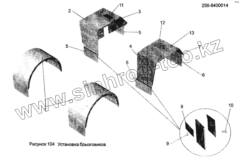 Каталог запасных частей к технике: АМАЗ МАЗ-256. Установка брызговиков 256-8400014