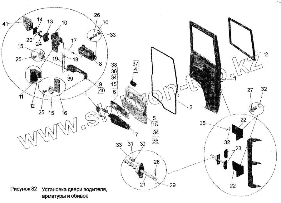 Каталог запасных частей к технике: АМАЗ МАЗ-256. Установка двери водителя, арматуры и обивок