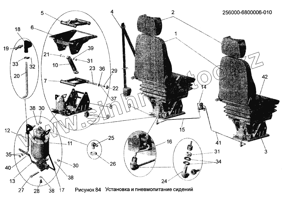 Каталог запасных частей к технике: АМАЗ МАЗ-256. Установка и пневмопитание сидений 256000-6800006-010