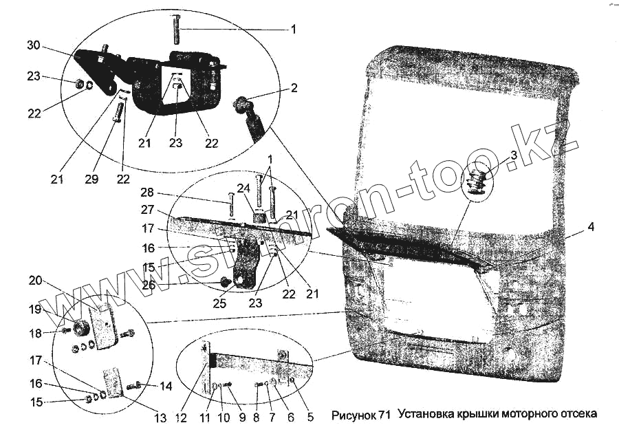 Каталог запасных частей к технике: АМАЗ МАЗ-256. Установка крышки моторного отсека 256000-5300020