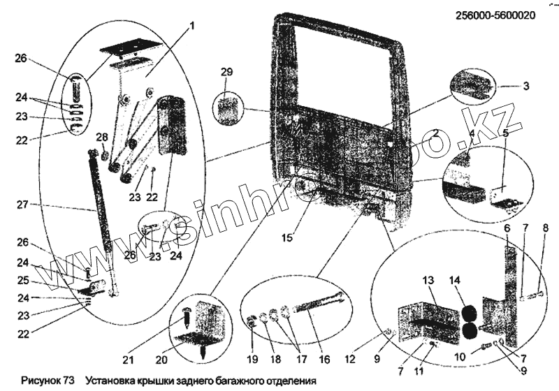 Каталог запасных частей к технике: АМАЗ МАЗ-256. Установка крышки заднего багажного отделения 256000-5600020
