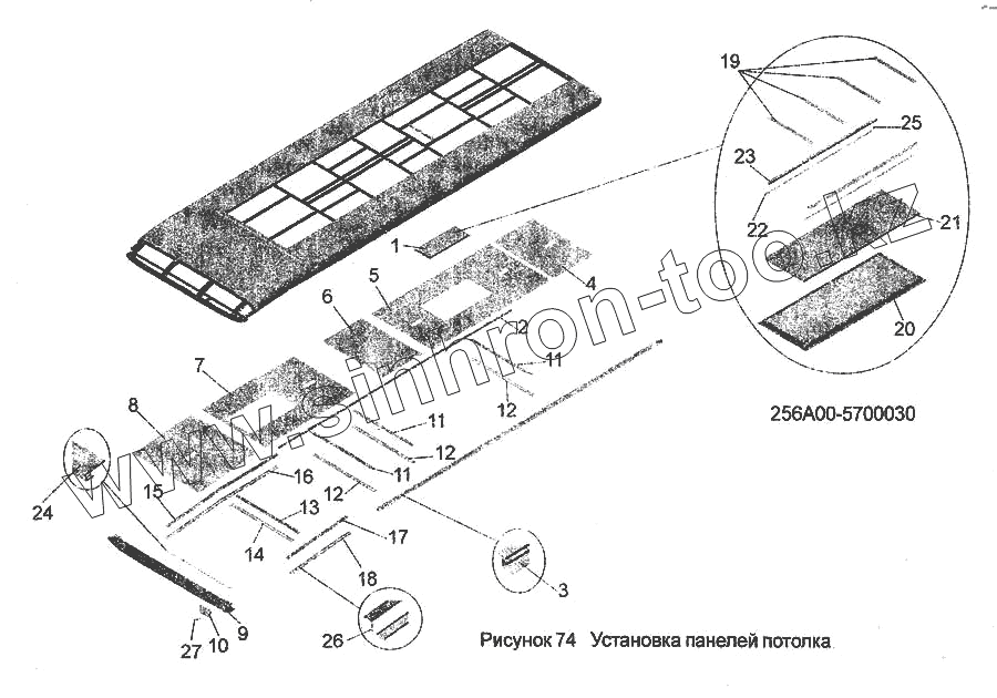 Каталог запасных частей к технике: АМАЗ МАЗ-256. Установка панелей потолка 256 А00-5700030