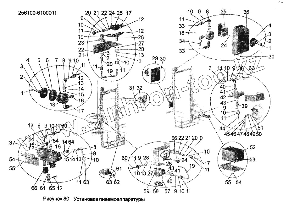 Каталог запасных частей к технике: АМАЗ МАЗ-256. Установка пневмоаппаратуры 256100-6100011
