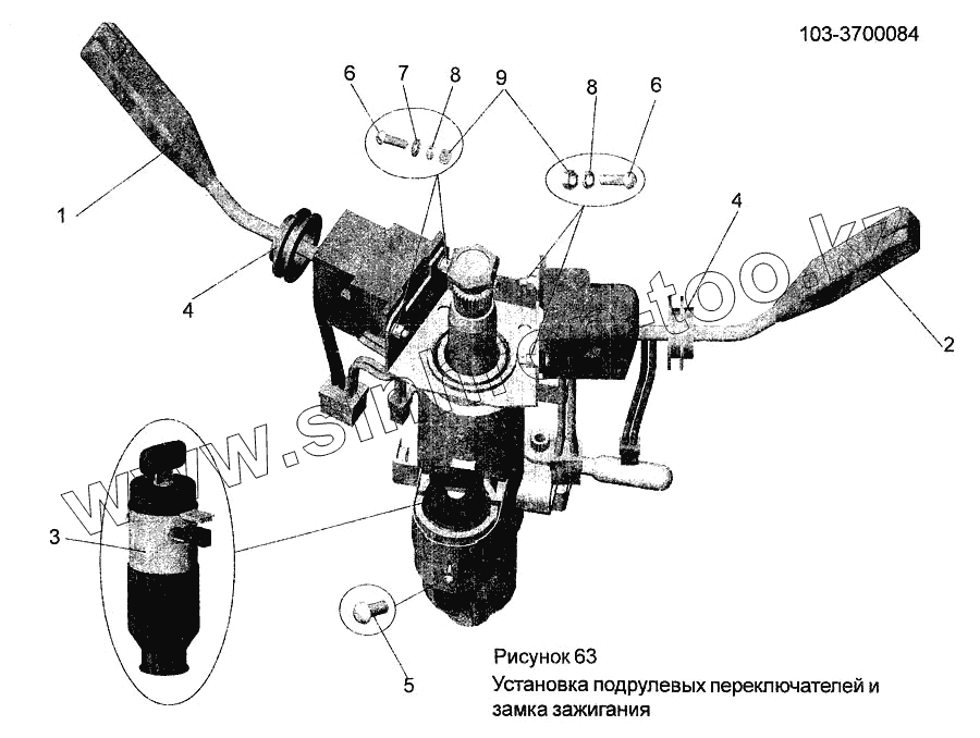 Каталог запасных частей к технике: АМАЗ МАЗ-256. Установка подрулевых переключателей и замка зажигания 103-3700084