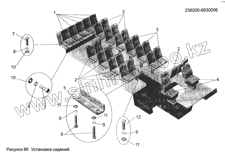 Каталог запасных частей к технике: АМАЗ МАЗ-256. Установка сидений 256200-6830006