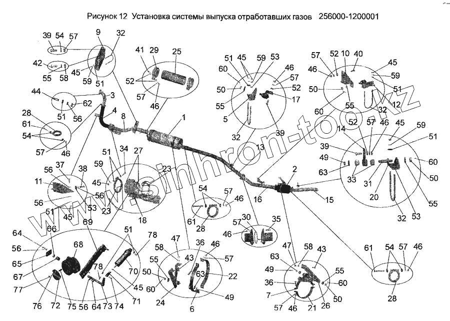 Каталог запасных частей к технике: АМАЗ МАЗ-256. Установка системы выпуска отработавших газов 256000-1200001