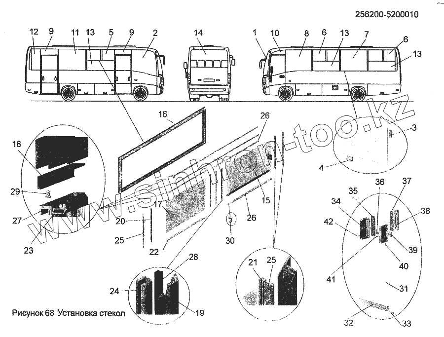 Каталог запасных частей к технике: АМАЗ МАЗ-256. Установка стекол 256200-5200010