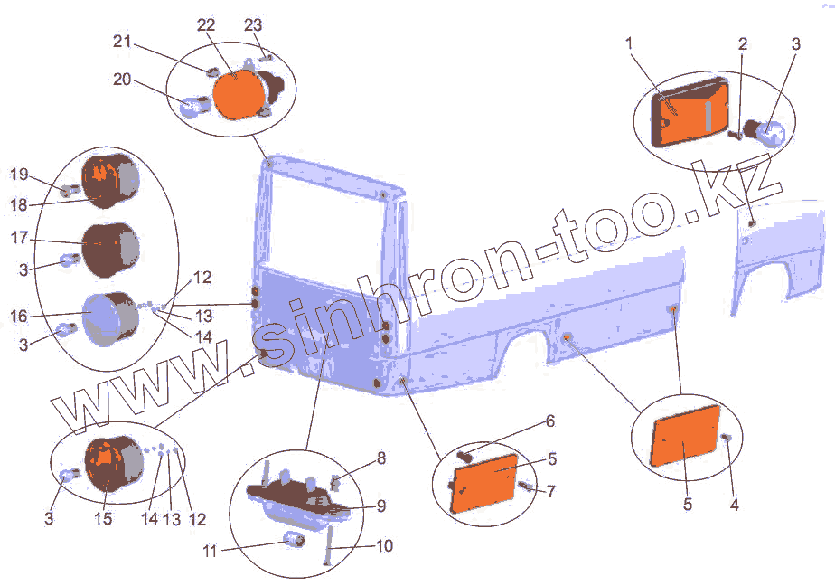 Каталог запасных частей к технике: АМАЗ МАЗ-256 (вариант). Установка задней и боковой светотехники