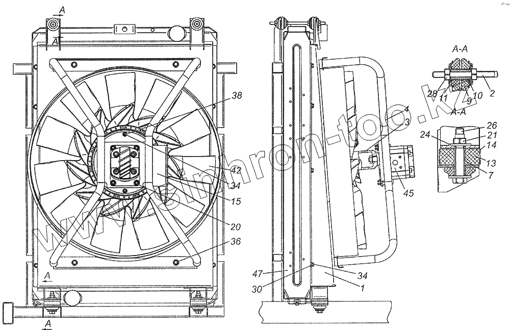 Каталог запасных частей к технике: Камский автозавод Шасси 52974. 52974-1301005 Радиатор с вентилятором