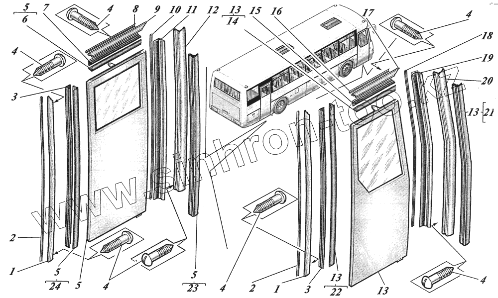 Каталог запасных частей к технике: КАВЗ-4238 "Аврора". Установка дверей 4230-6100002-20