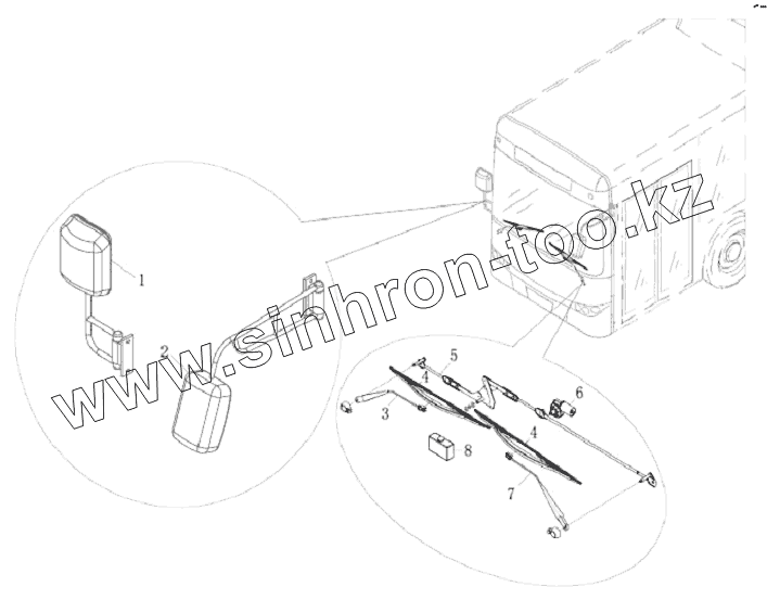 Каталог запасных частей к технике: King Long Автобус XMQ-6127J. REARVIEW MIRROR AND WIPER