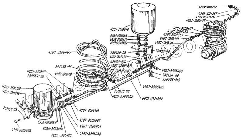 Каталог запасных частей к технике: ЛАЗ 4207. Воздухоочиститель и трубопроводы компрессора