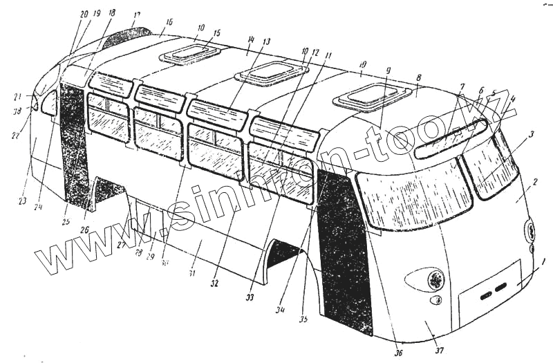 Каталог запасных частей к технике: ЛАЗ 695Б. Облицовка и окна автобуса