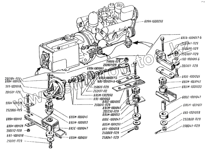Каталог запасных частей к технике: ЛАЗ 699Р. Двигатель в сборе и подвеска двигателя