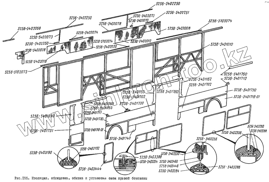Каталог запасных частей к технике: ЛиАЗ 5256. Изоляция, облицовка, обивка и установка окон правой боковины
