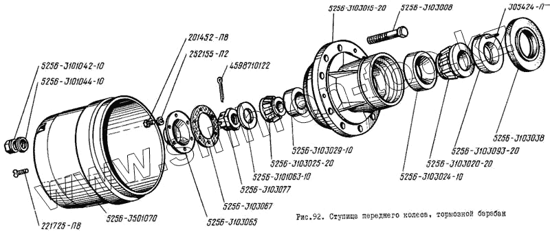 Каталог запасных частей к технике: ЛиАЗ 5256. Ступица переднего колеса, тормозной барабан
