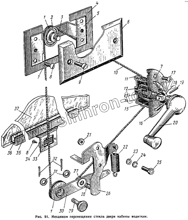 Каталог запасных частей к технике: ЛиАЗ 677. Механизм перемещения стекла двери кабины водителя