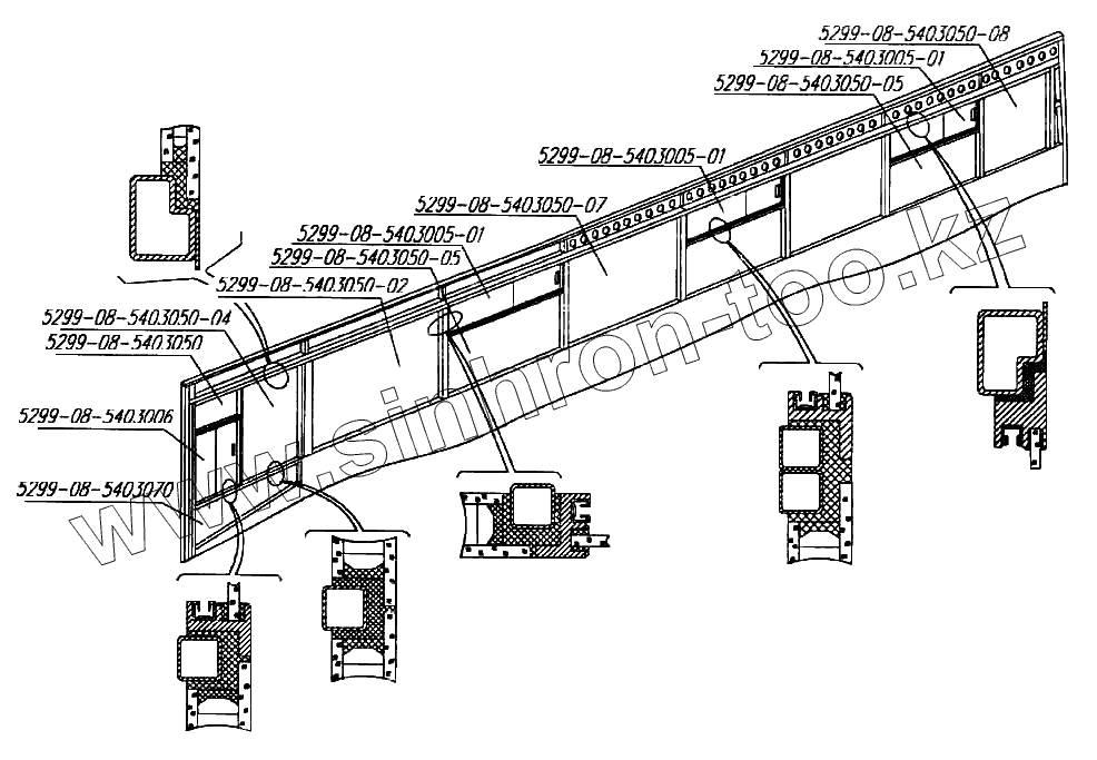 Каталог запасных частей к технике: Нефтекамский автозавод 5299-08 (надстройка). Установка окон левой боковины