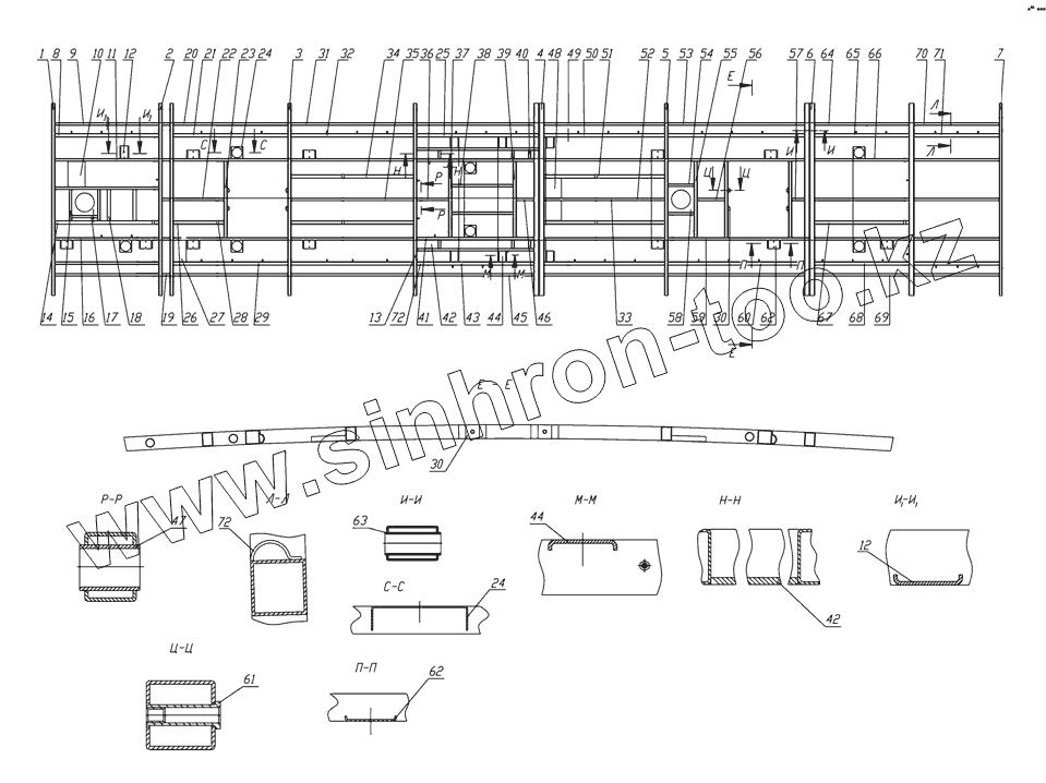 Каталог запасных частей к технике: Нефтекамский автозавод 5299-37-32 (надстройка). Каркас крыши 5299-37-5701010СБ