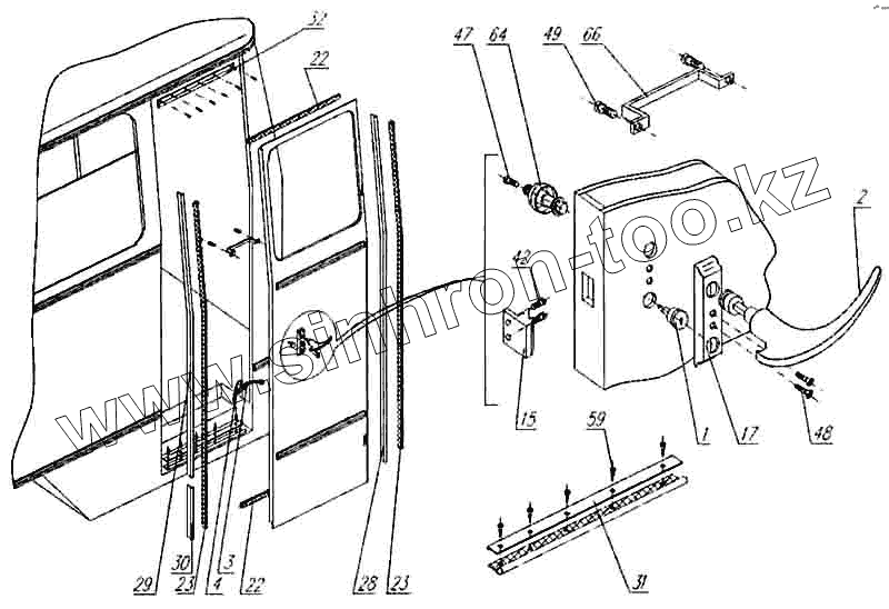 Каталог запасных частей к технике: Нефтекамский автозавод НефАЗ-4208, НефАЗ-42111. Установка передней двери