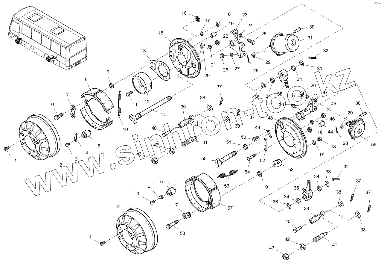 Каталог запасных частей к технике: ПАЗ-3204. Тормоза рабочие передние, задние и барабаны