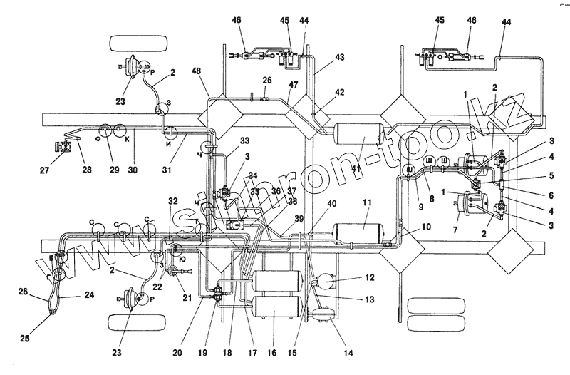 Каталог запасных частей к технике: ПАЗ-32053. Схема пневматической системы тормозов с пневмоаппаратурой