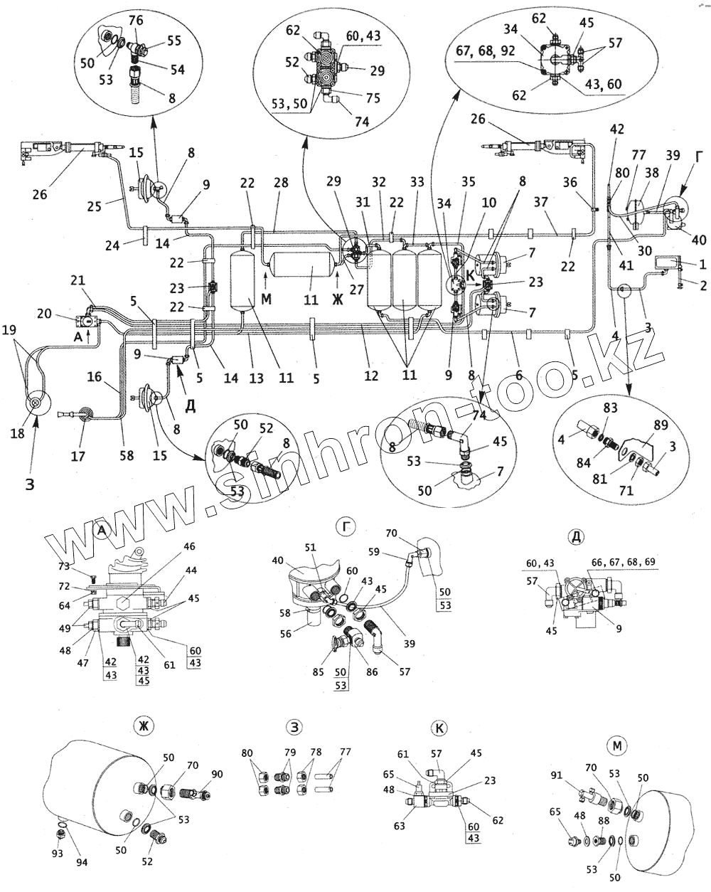 Каталог запасных частей к технике: ПАЗ-4230. Схема пневматической системы тормозов с пневмоаппаратами
