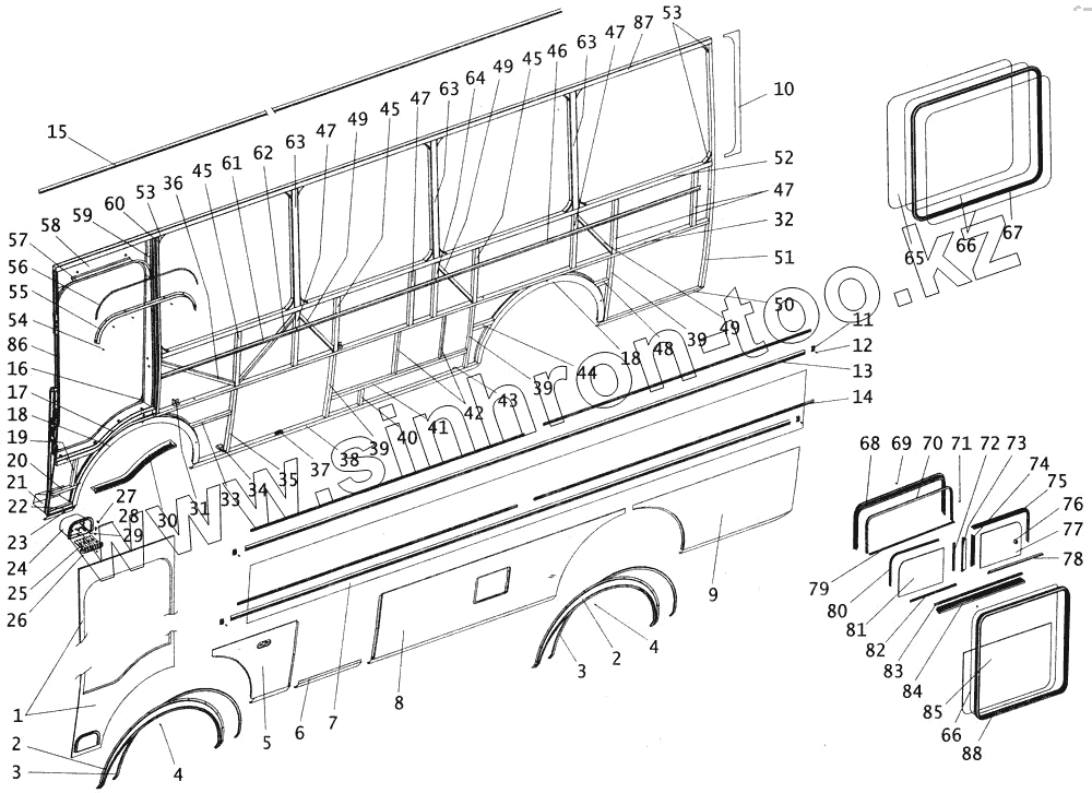 Каталог запасных частей к технике: ПАЗ-4234. Боковина кузова автобуса ПАЗ3205307 левая с остеклением
