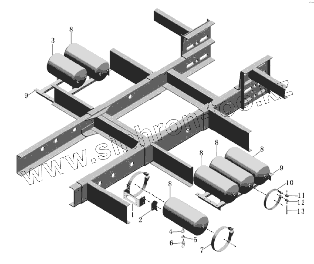 Каталог запасных частей к технике: Yutong Автобус ZK6118HGA. Монтаж воздушного ресивера (для российского автобуса)