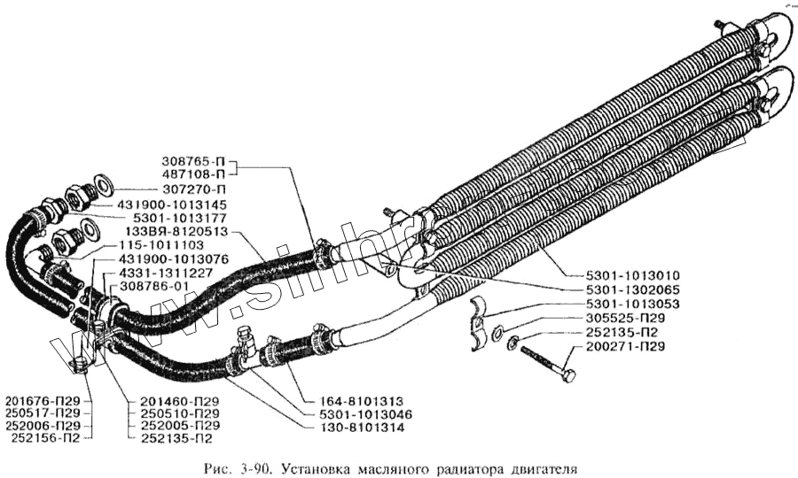 Каталог запасных частей к технике: ЗИЛ-3250. Установка масляного радиатора двигателя