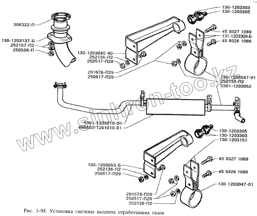 Каталог запасных частей к технике: ЗИЛ-3250. Установка системы выхлопа отработавших газов