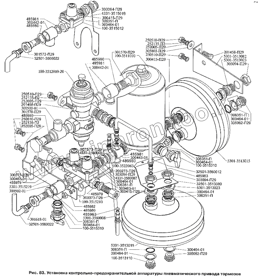 Каталог запасных частей к технике: ЗИЛ-3250. Установка контрольно-предохранительной аппаратуры пневматического привода тормозов