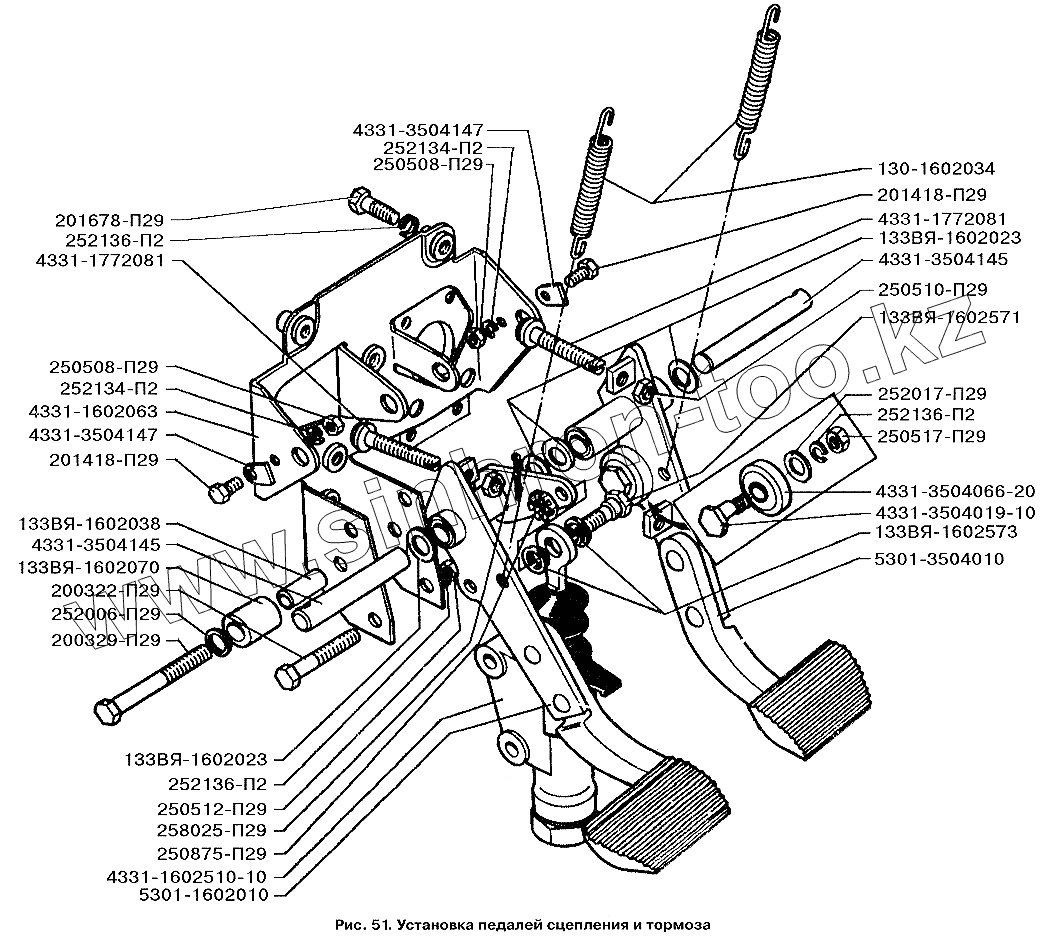 Каталог запасных частей к технике: ЗИЛ-3250. Установка педалей сцепления и тормоза