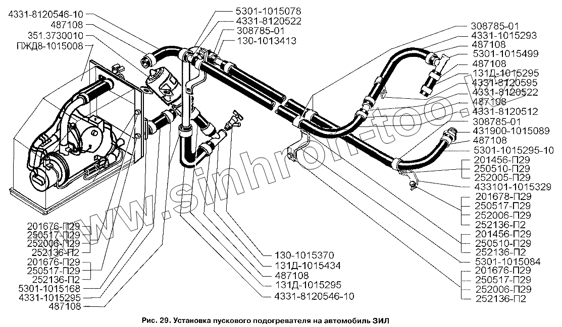 Каталог запасных частей к технике: ЗИЛ-3250. Установка пускового подогревателя на автомобиль ЗИЛ-5301