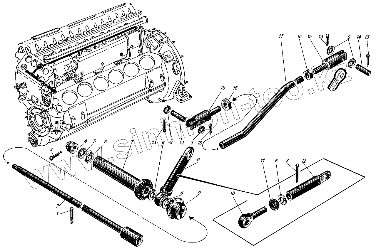 Каталог запасных частей к технике: Барнаултрансмаш Дизели Д12С1. Валик дистанционного управления и привод топливного насоса